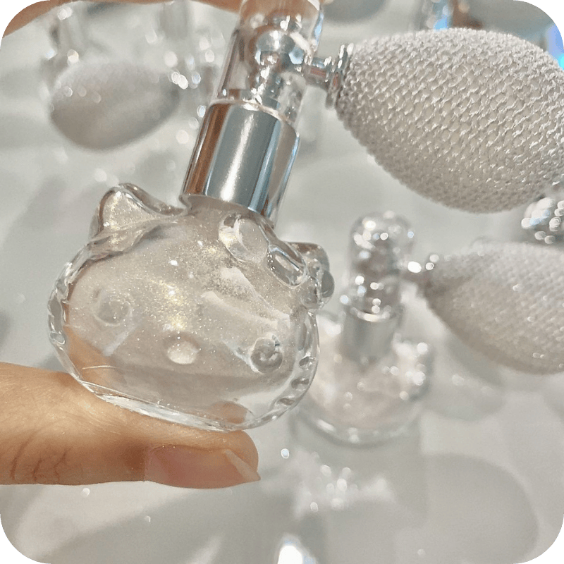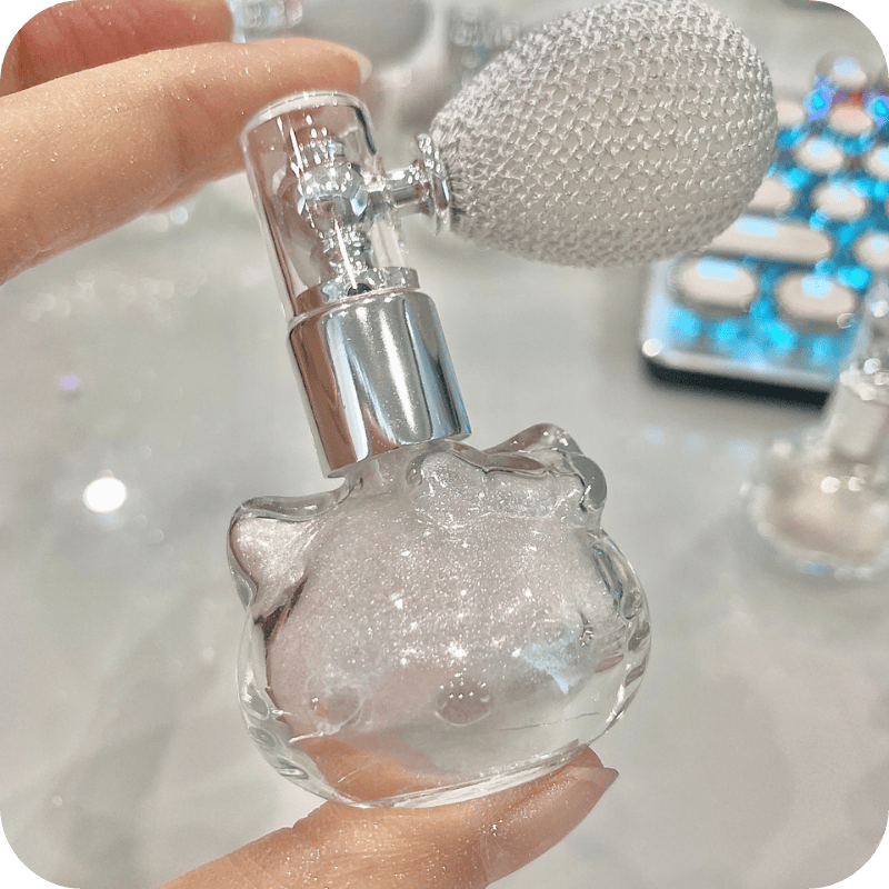 Cute Kitty-shaped shimmer powder spray: Use it for makeup as highlighter or setting powder to add sparkling glow, or spray on decor like Christmas trees for extra shine. Lightweight, portable and multi-use.
